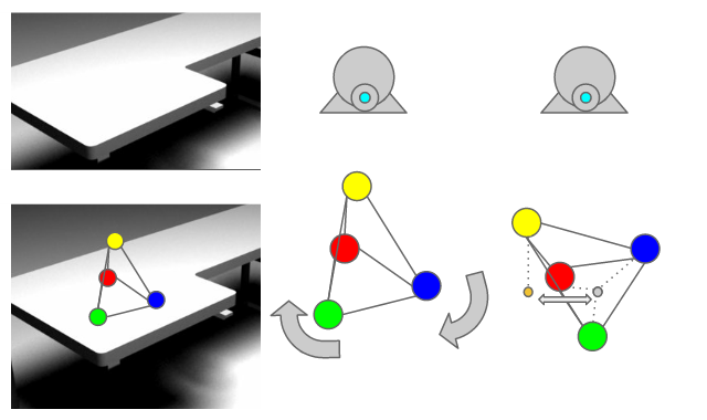 The yellow sphere is used for tilt (top of the tetrahedron), the other three spheres represent the base of the tetrahedron and are used for rotation. The clockwise orientation of the three base spheres tell us whether the yellow sphere is "in front" or "behind" the base plane (relative to the camera). By using known properties of unilateral tetrahedra, we convert these 2D coordinates to 3D and subsequently calculate the resulting 3D orientation of the object on the screen.